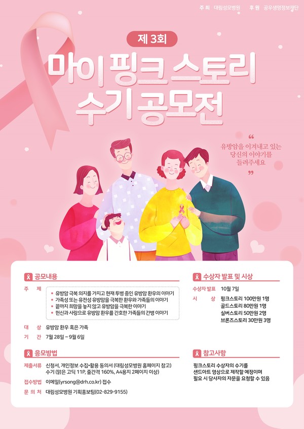 유방암 특화병원인 대림성모병원(병원장 김성원)과 공우생명정보재단(이사장 서정선)이 '제3회 마이 핑크 스토리 수기 공모전'을 개최한다고 밝혔다.