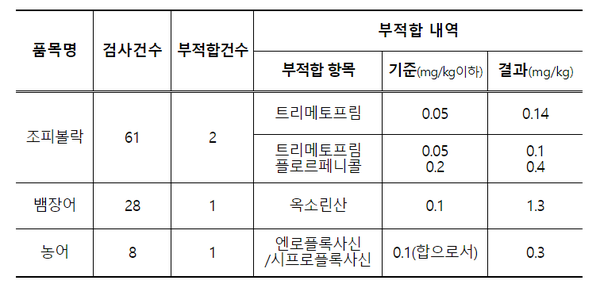 부적합 수산물은 조피볼락 2건, 뱀장어 1건, 농어 1건이며 부적합 수산물을 출하한 양식장에 대해서는 안전성조사를 실시하고 관련 법령에 따라 과태료 부과 및 고발 등의 조치를 취할 예정이다.