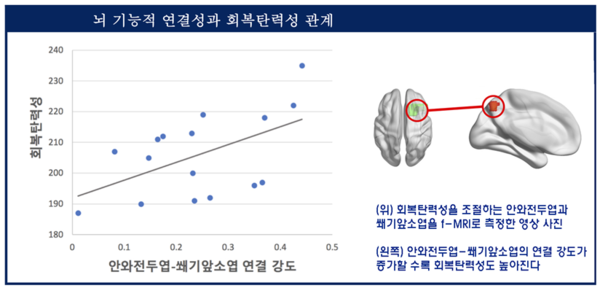 뇌 기능 연결 강도 뇌는 여러 신경망과의 다양한 연결을 통해 주변의 어려움에 적응하는 기능을 갖는다. 보수성향의 사람들은 자기조절능력이나 회복탄력성과 관련이 있는 뇌 기능적 연결성이 진보보다 약 5배 높게 나타났다. 즉, 보수성향의 뇌는 심리적 안정성이 진보성향의 사람보다 높은 것이라고 연구팀은 설명했다.