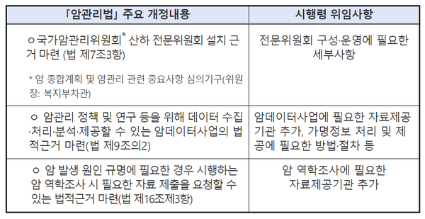 이번 개정안은 지난 4월 8일에 암관리에 필요한 주요 사업의 법적 근거를 담은 「암관리법」 개정안(‘21.4.7 시행예정)에서 시행령으로 위임한 내용과, 기존 암관리 사업을 효율적으로 운영하기 위한 세부사항을 구체적으로 정하기 위한 것이다.
