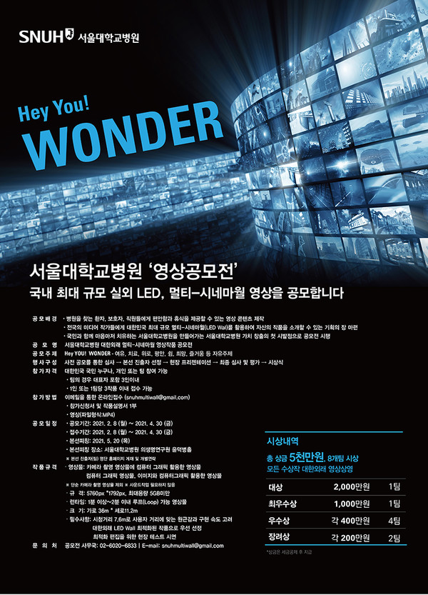 서울대병원은 오는 2월 8일부터 4월30일까지 국내 최대 규모 실외 LED, 멀티-시네마월 영상을 공모한다.