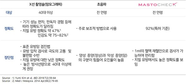 다만 젊은 여성이나 가임기 여성에서는 방사선 노출이 불가피한 유방촬영술이 권고되지 않으며, 유방초음파 또한 국가암검진질지침에서 권고 근거가 낮은 검진법인 점을 감안할 때, 유방암 검진을 필요로 하는 다양한 연령대 여성이 선택할 수 있는 진단 옵션의 폭이 좁다는 한계가 있다. 특히 유방촬영술, 유방초음파의 경우 기기 성능이나 판독자에 따라 정확도가 달라질 수 있고, 한국 여성의 대다수가 해당하는 유방이 작고 유선 조직이 발달한 치밀 유방의 경우 암 병변 확인이 어려워 보다 정확한 진단 옵션에 대한 필요성이 대두되고 있다.