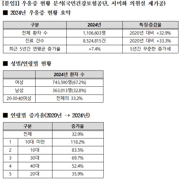 서미화 더불어민주당 의원(보건복지위원회)이 국민건강보험공단에서 제출받은 자료에 따르면, 2024년 우울증 환자는 110만 6,603명으로 2020년(83만 2,483명)보다 32.9% 늘었다. 같은 기간 진료 건수는 639만 4,820건에서 852만 4,815건으로 33.3% 증가했다.