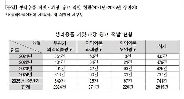 [메디컬리포트뉴스 유제원 기자] 서미화 국회의원(더불어민주당, 보건복지위)이 식품의약품안전처로부터 제출받은 자료에 따르면, 최근 5년간(2021년-2025년 상반기) 온라인 점검을 통해 생리용품 거짓·과장 광고로 적발된 건수는 총 2,815건에 달했다.