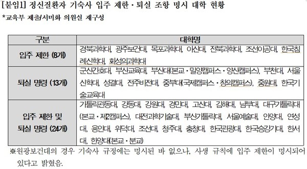 [메디컬리포트뉴스 노은지 기자] 서미화 국회의원(더불어민주당, 보건복지위)이 교육부로부터 제출받은 ‘대학 기숙사 정신질환자 입주 거부 전수 조사’ 자료에 따르면, 45개의 대학에서 정신질환자 학생을 기숙사 입주 제한 또는 강제 퇴실 대상으로 규정하고 있는 것으로 확인됐다.