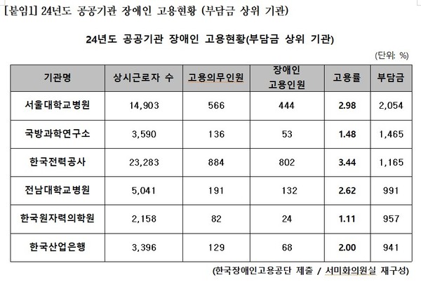 서미화 국회의원(더불어민주당, 보건복지위원)이 한국장애인고용공단으로부터 제출받은 자료에 따르면, 2024년 기준 전체 779개 공공기관 중 276개 기관이 장애인 의무고용률(3.8%)을 준수하지 못해 부담금이 발생했다.