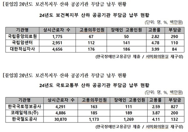 특히 장애인 정책을 담당하는 보건복지부 산하 공공기관 중에서도 국립중앙의료원 2억 9,000만 원, 국립암센터 1억 1,000만 원, 대한적십자사 8,400만 원 등 9곳이 부담금을 납부했다. 또한, 고용노동부 산하 한국산업인력공단 역시 7,800만 원을 납부한 것으로 집계됐다.