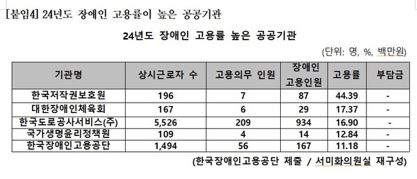 반면, 장애인 고용률이 높은 기관으로는 한국저작권보호원(44.4%), 대한장애인체육회(17.3%), 한국도로공사서비스(16.9%), 국가생명윤리정책원(12.8%), 한국장애인고용공단(11.2%) 등이 꼽혔다.