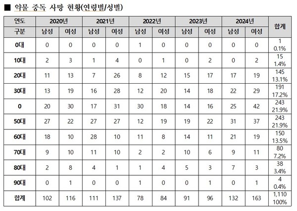 서미화 더불어민주당 의원(국회 보건복지위원회)이 국립과학수사연구원으로부터 제출받은 자료에 따르면, 2020년부터 2024년까지 약물 급성 중독으로 사망한 사람은 총 1,110명이었다. 여성이 596명(53.7%), 남성이 514명(46.3%)이다.