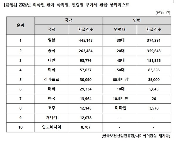 지난해 기준 미용·성형 부가세 환급을 가장 많이 받은 외국인은 일본인으로 집계됐다. 상위 10위 국가 중 일본이 44만5143건 환급으로 가장 많았고, 이어 중국(26만3483건), 대만(9만3776건), 미국(5만7637건), 싱가포르(3만90건), 태국(2만9334건) 순이었다.