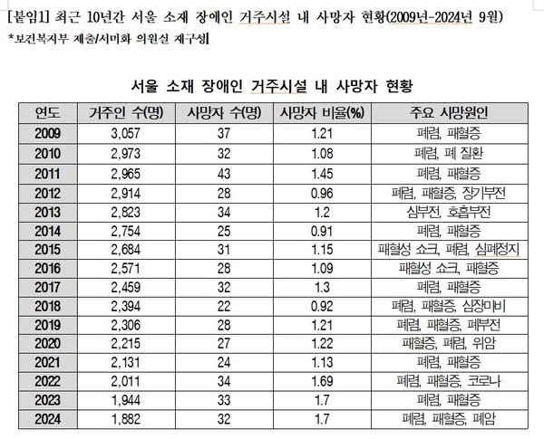 거주인 수는 지속적으로 줄어들었음에도 사망자 수는 거의 변하지 않았다. 서울 소재 장애인 거주시설 거주인은 2009년 3,057명이었으나 2024년 1,882명으로 1천 명 이상 감소했다. 그러나 사망자 수는 2009년 37명, 2024년 32명으로 사망률은 1.21%에서 1.70%로 오히려 상승했다. 이는 단순히 시설 거주 인원 감소가 곧 사망률 감소로 이어지지 않으며, 시설 환경 자체가 장애인의 건강을 위협하는 요인으로 작용할 수 있음을 보여준다.