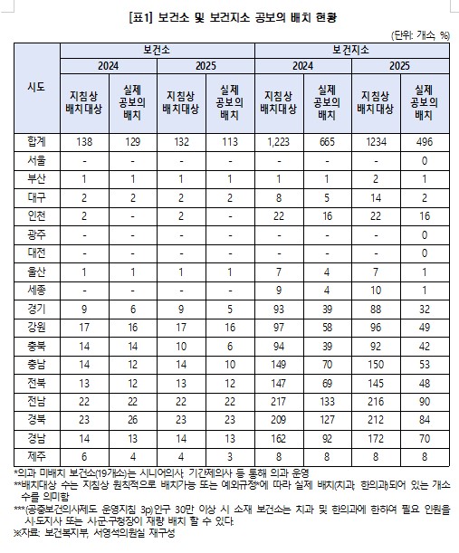 보건지소의 경우는 지침상 배치대상 보건지소는 2024년 1,223개소에서 올해 6월 기준 1,234개소로 11개소 증가했다. 그러나 실제 공보의 배치 보건지소 수는 665개소에서 496개소로 급락하여 배치율 50%조차 붕괴됐다. 지침상 배치대상 보건지소가 있는 시도 중에서는 제주를 제외한 모든 지역에서 공보의를 다 채우지 못하고 있다.