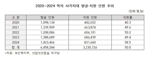 국회 보건복지위원회 서영석 의원(더불어민주당, 부천시 갑)이 보건복지부로부터 제출받은 ‘복지 사각지대 발굴시스템 운영 현황’ 자료에 따르면 복지부의 복지 사각지대 발굴시스템은 2020년 이후 매년 탐지 인원을 확대해 왔으나 발굴 대비 지원율은 평균 50% 내외에 머무르며 정체 상태를 보이고있다.