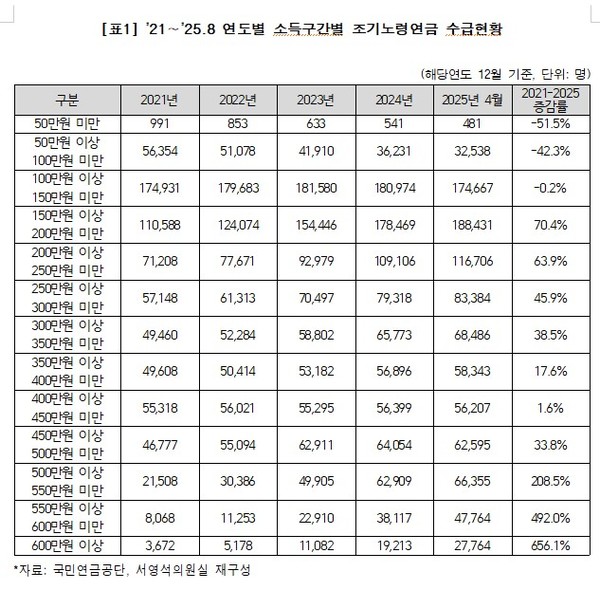 조기노령연금이 고소득층을 위한 수단으로 변질된 사실은 소득구간별 수급자 통계를 통해 확인된다. 공단 자료에 따르면 소득이 초고소득 구간인 500만원 이상 550만원 미만, 550만원 이상 600만원 미만, 600만원 이상 구간에서 2021년 대비 2025년 조기수급자는 각각 208.5%, 492%, 656.1% 증가한 것으로 나타났다. 반면, 본래 제도의 이용 대상인 50만 원 미만인 저소득 구간에서는 같은 기간 절반이 넘게 감소했고, 50만 이상 100만원 이하에서는 42.3%, 100만원 이상 150만원 이하에서는 0.2% 감소했다.