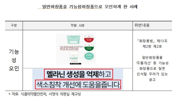한편 최근 3년간 피부재생·염증완화 등 허위·과장 문구로 적발된 책임판매업체는 총 35개사이며 이 중 일부는 동일 유형의 부당광고로 반복 적발된 사례도 확인됐다. 현재 10개소는 행정처분이 진행 중이며 25개소는 지방식약청에서 점검을 받고 있다. 적발 업체에는 ㈜아이썸코리아, ㈜스와니코코, ㈜메디톡스, ㈜이너타이드, ㈜아이디플라코스메틱 등 국내외 유명 브랜드가 포함됐다.