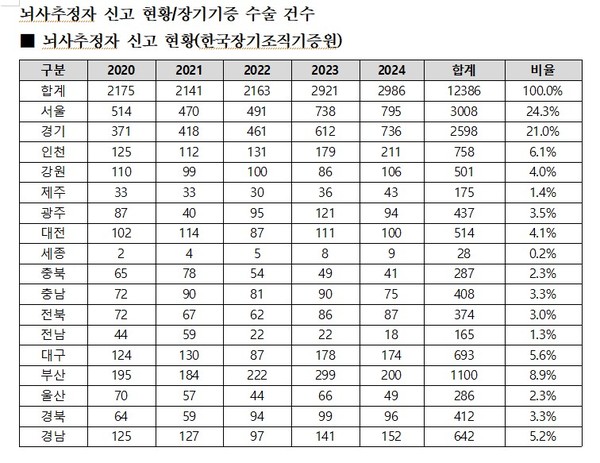 서미화 더불어민주당 의원(국회 보건복지위원회)이 한국장기조직기증원과 국립장기조직혈액관리원으로부터 제출받은 자료에 따르면, 최근 5년간(2020~2024년) 잠재적 장기기증자인 뇌사추정자는 총 12,386명으로 집계됐다. 지역별로는 ▲서울 24.3%(3,008명), ▲경기 21%(2,598명), ▲부산 8.9%(1,100명), ▲인천 6.1%(758명) 등으로 인구 규모와 대체로 비례했다.
